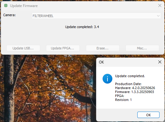 This update resolves an issue that may have occurred in the previous version where the wheel would spin continuously under certain conditions. The problem is that the LED does not turn off after switching the filter wheel (to slots other than slot 1), which can cause light to leak into the main camera.